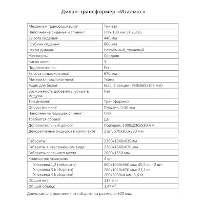 Диван-трансформер Италмас (Аквилон) продается в интернет-магазине mebelin-naro-fominsk.ru по цене 73 376 руб. Есть доставка по Наро-Фоминску и Московской области. Возможность подъема на этаж и сборки уточняйте у менеджера по телефону 8(800)505-27-11.